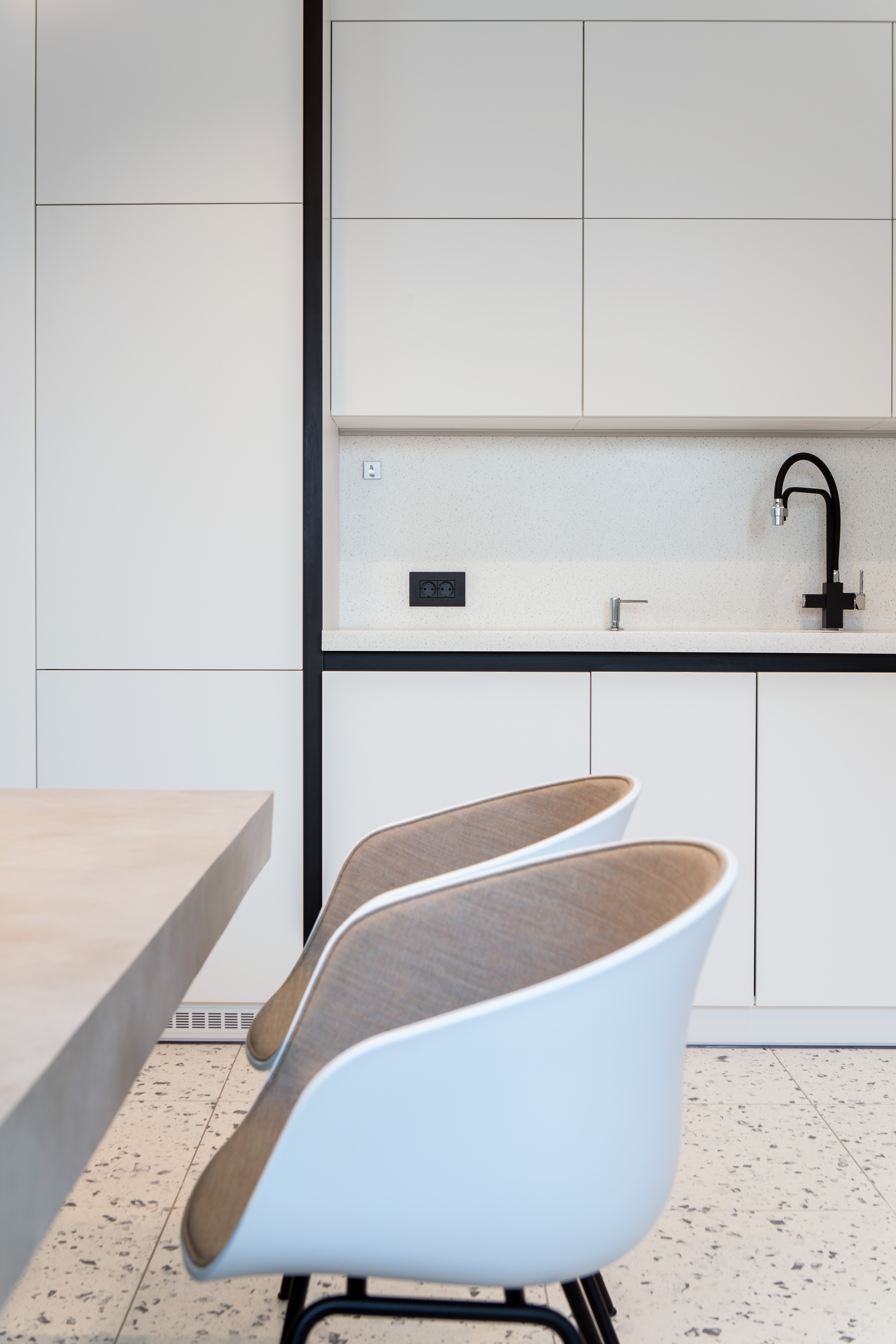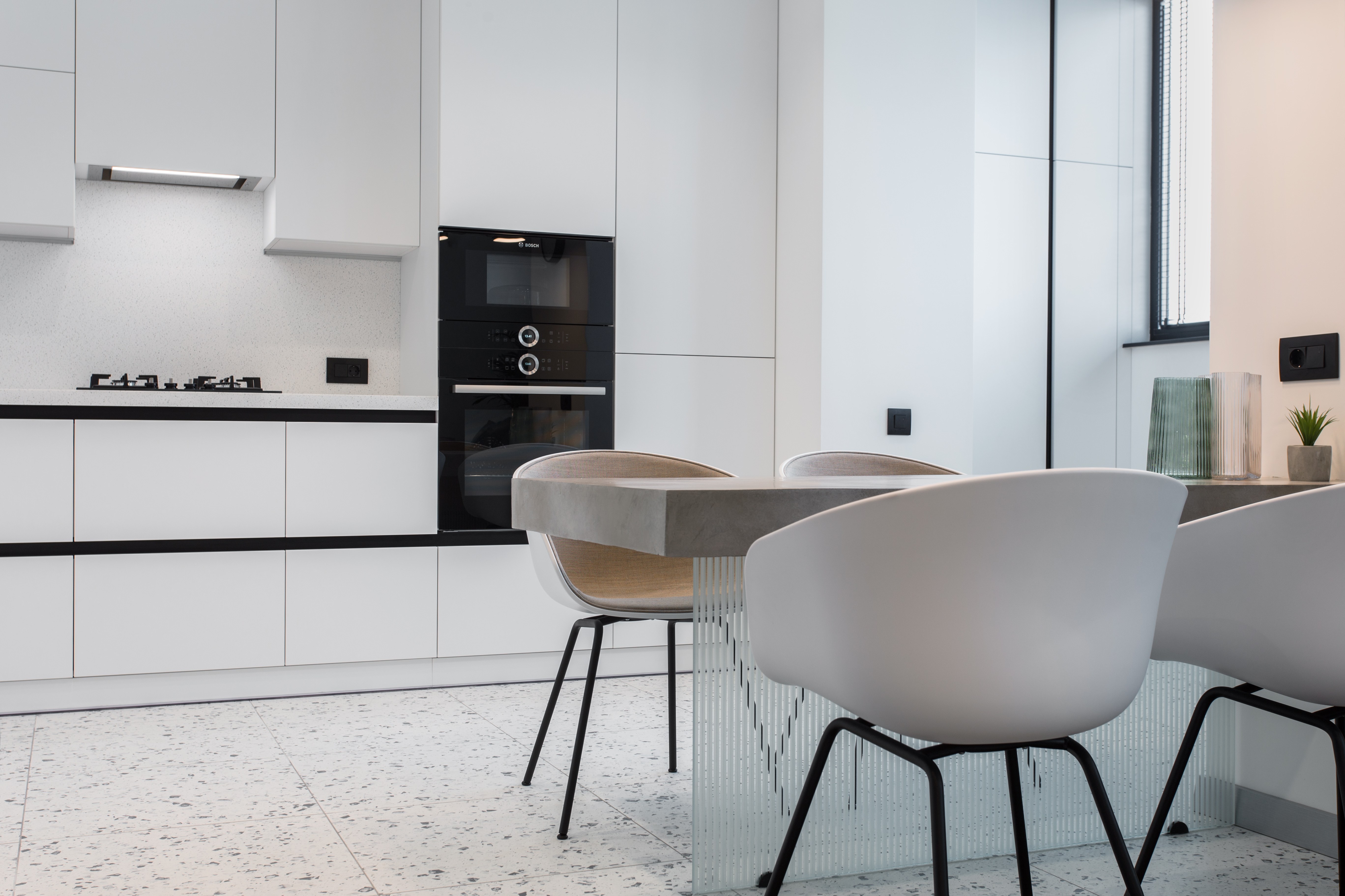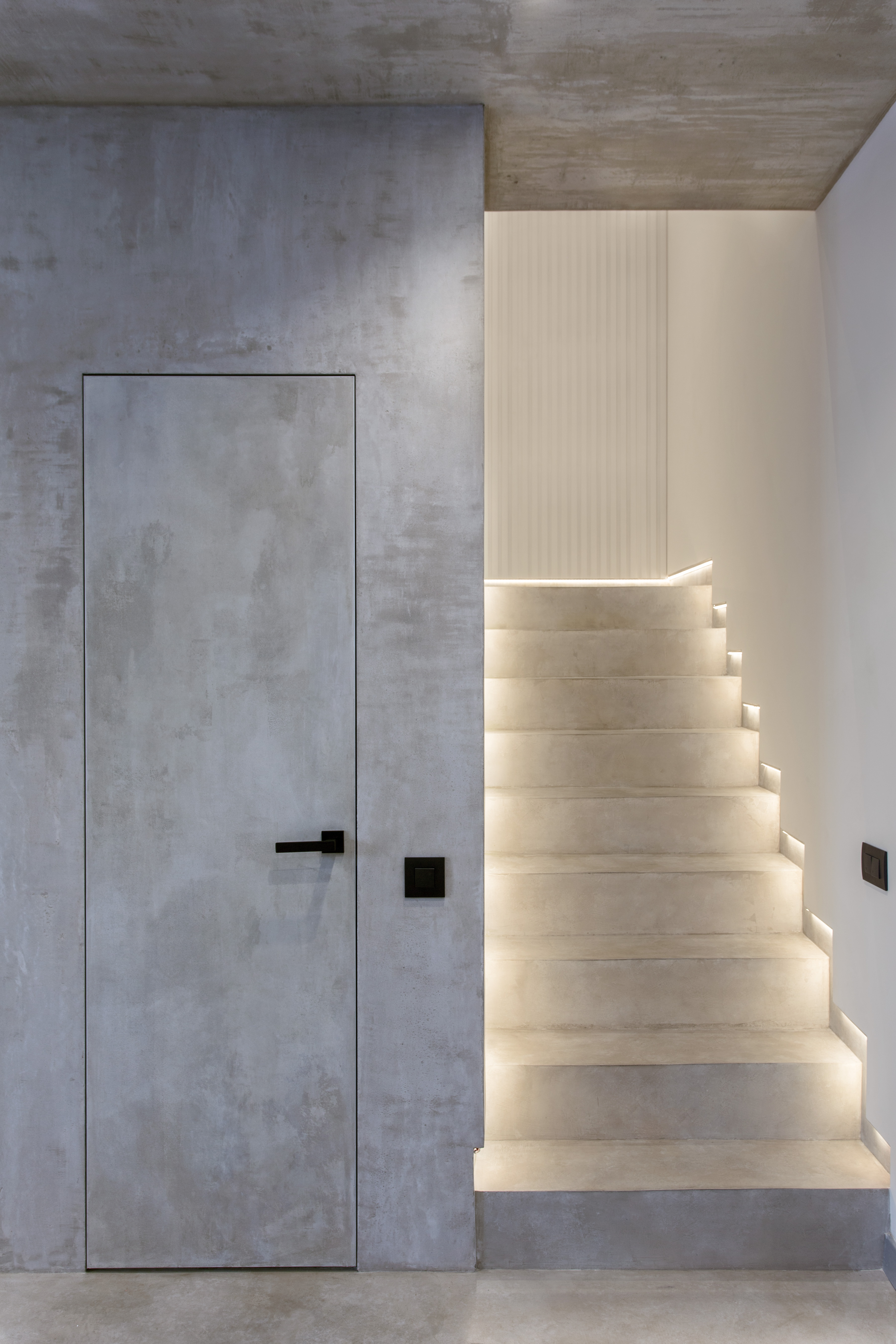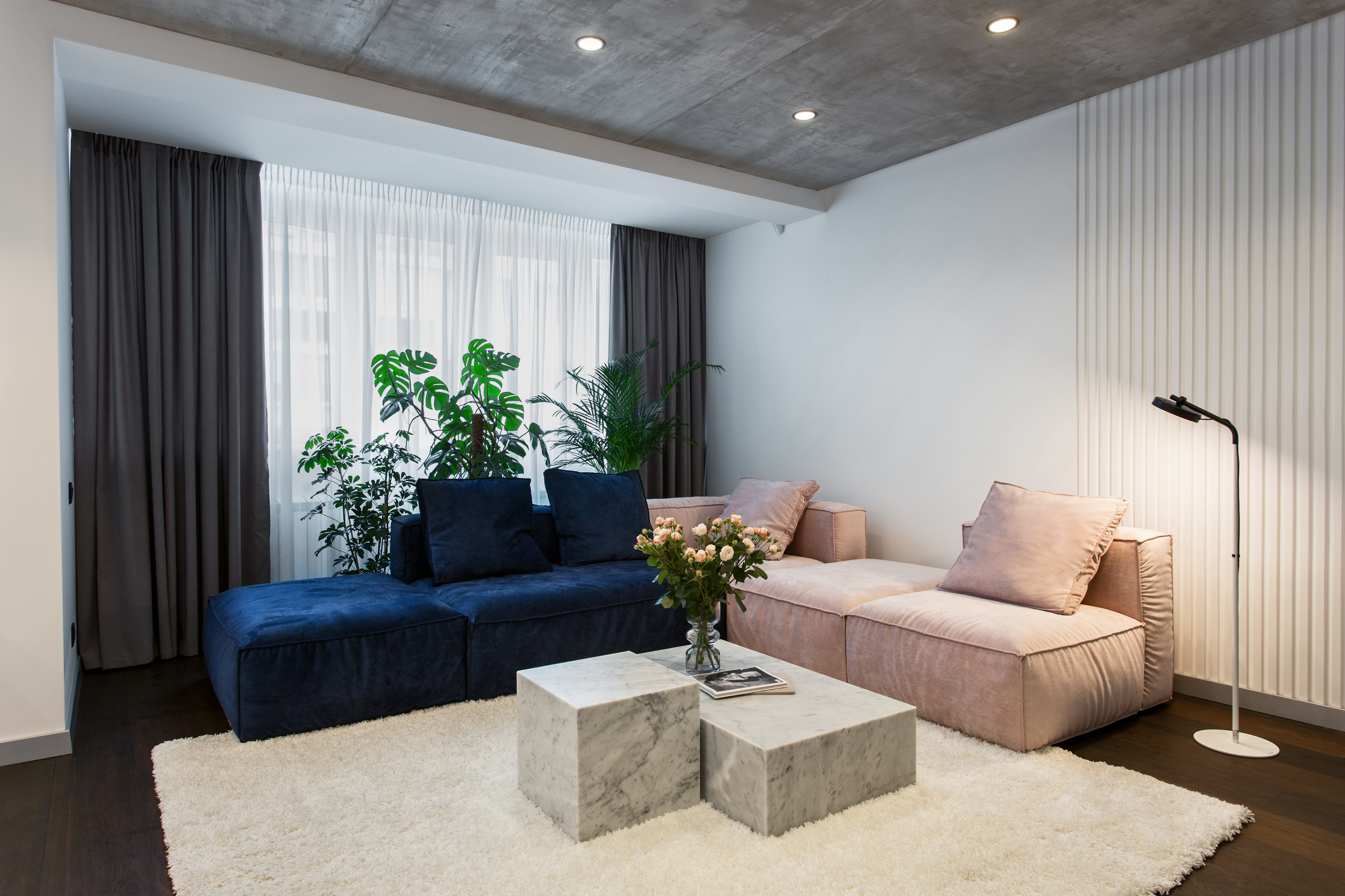 Customers wanted a strict apartment not looked like an office. As a result, the main idea of the project was a combination of rough and contrasting textures of concrete and terrazzo with delicate fabrics textures, soft carpets and strict black and white surfaces.