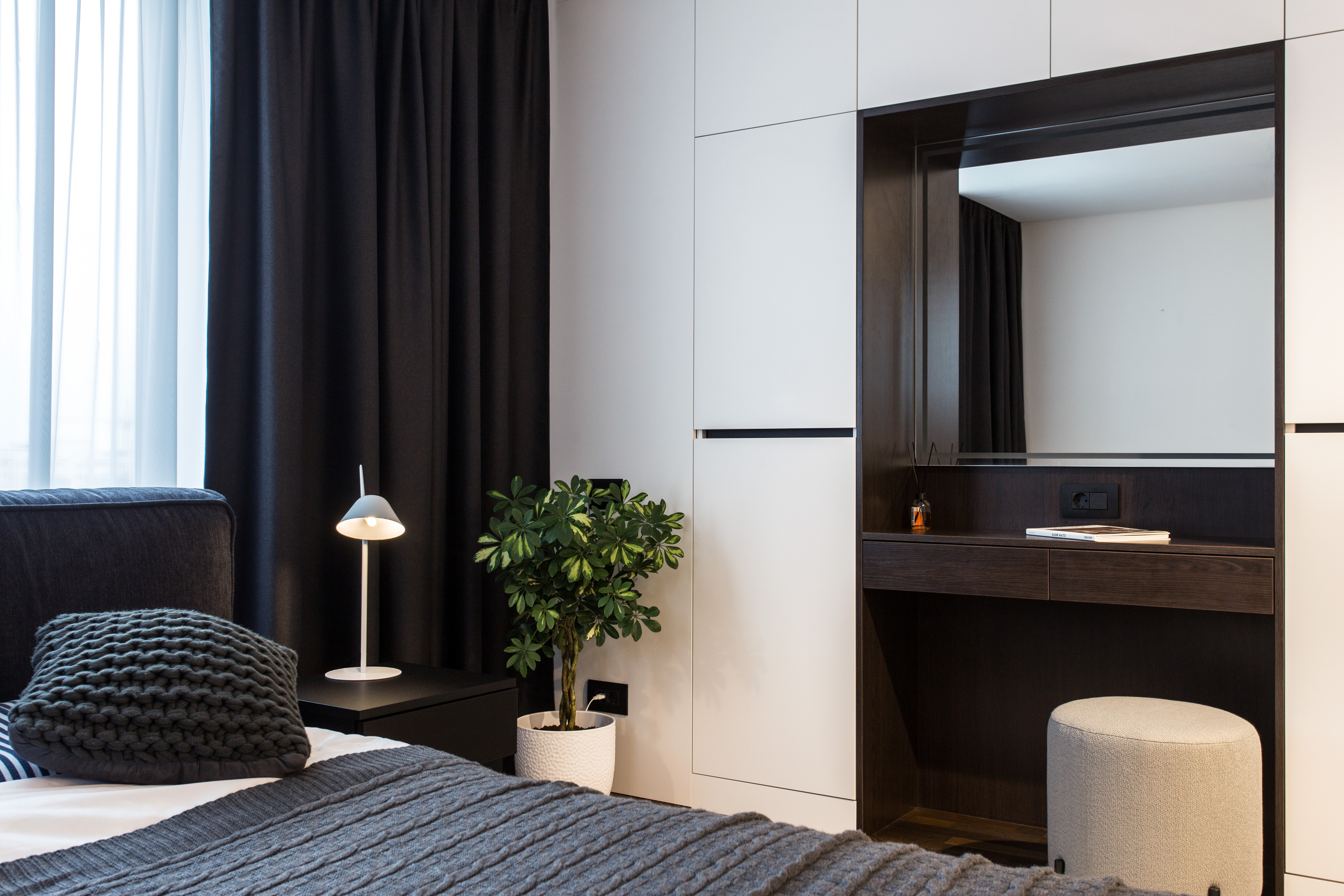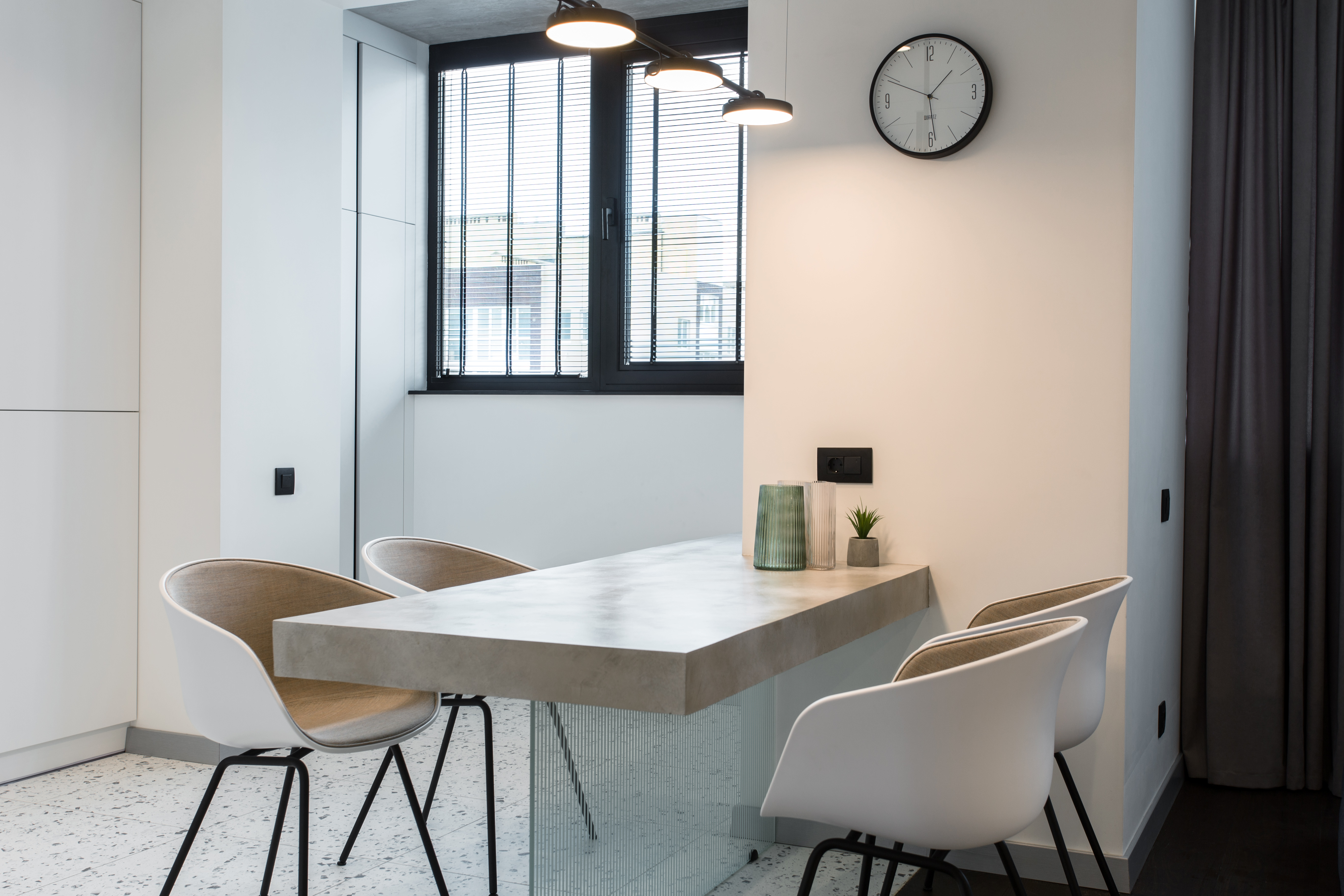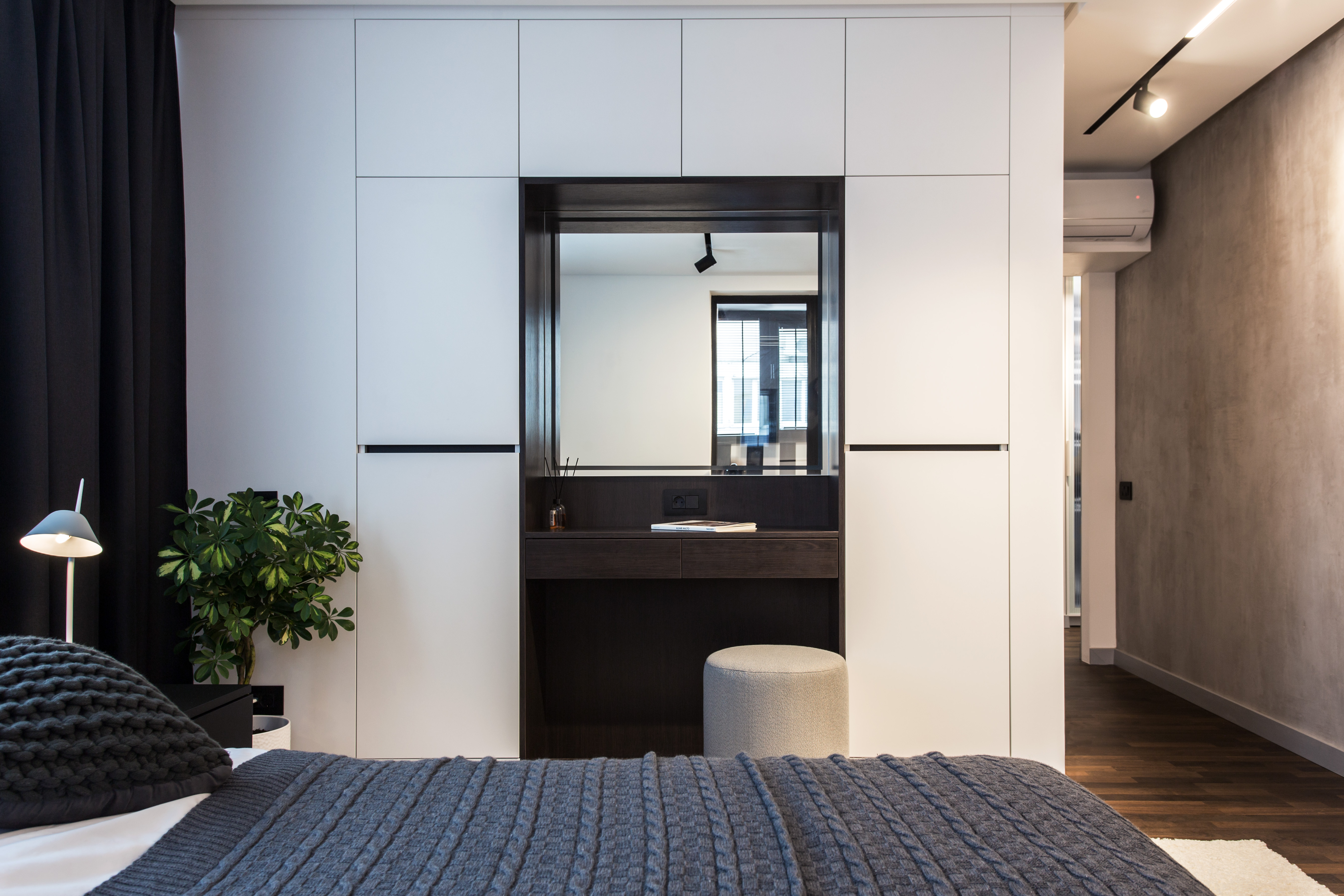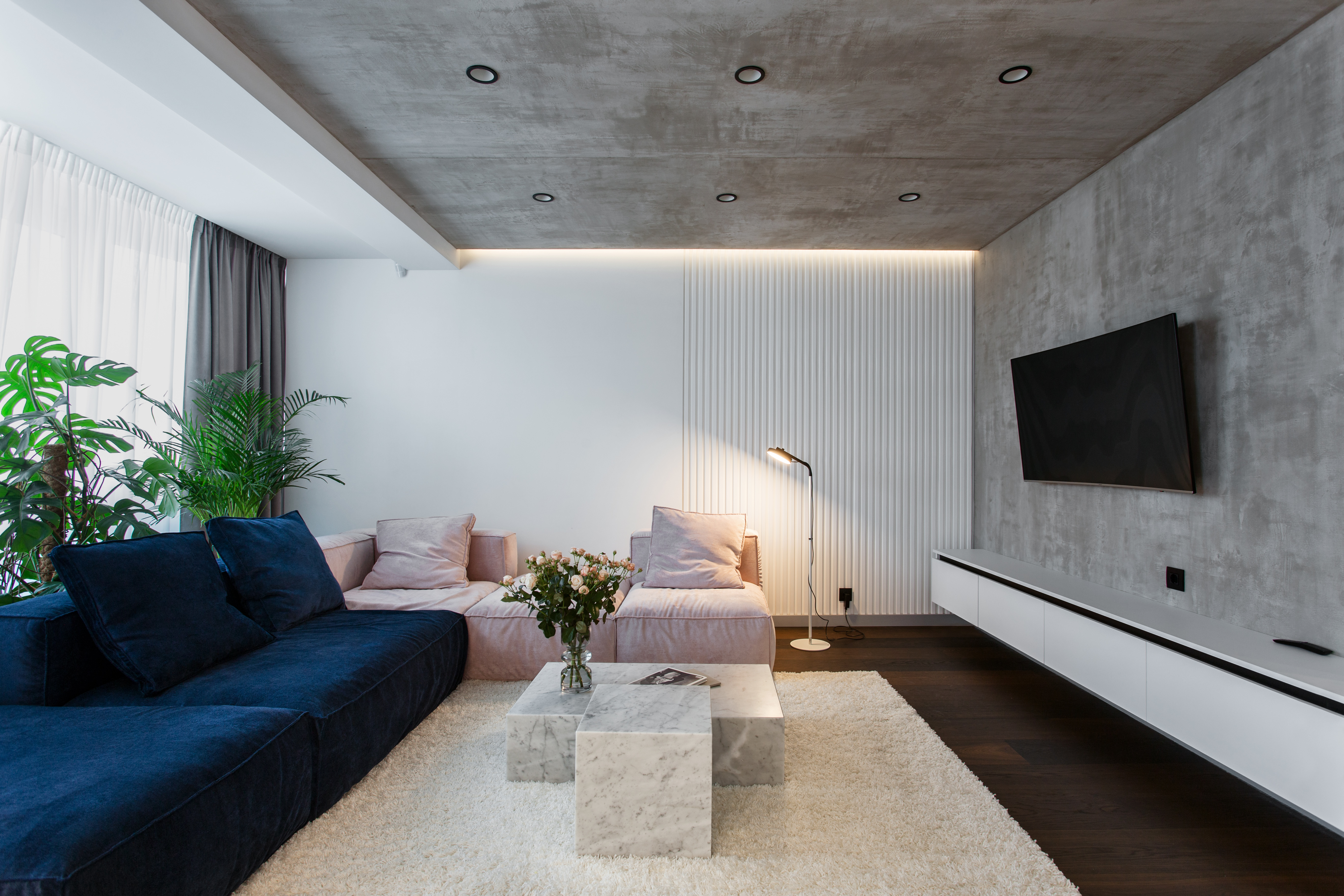 Customers wanted a strict apartment not looked like an office. As a result, the main idea of the project was a combination of rough and contrasting textures of concrete and terrazzo with delicate fabrics textures, soft carpets and strict black and white surfaces.