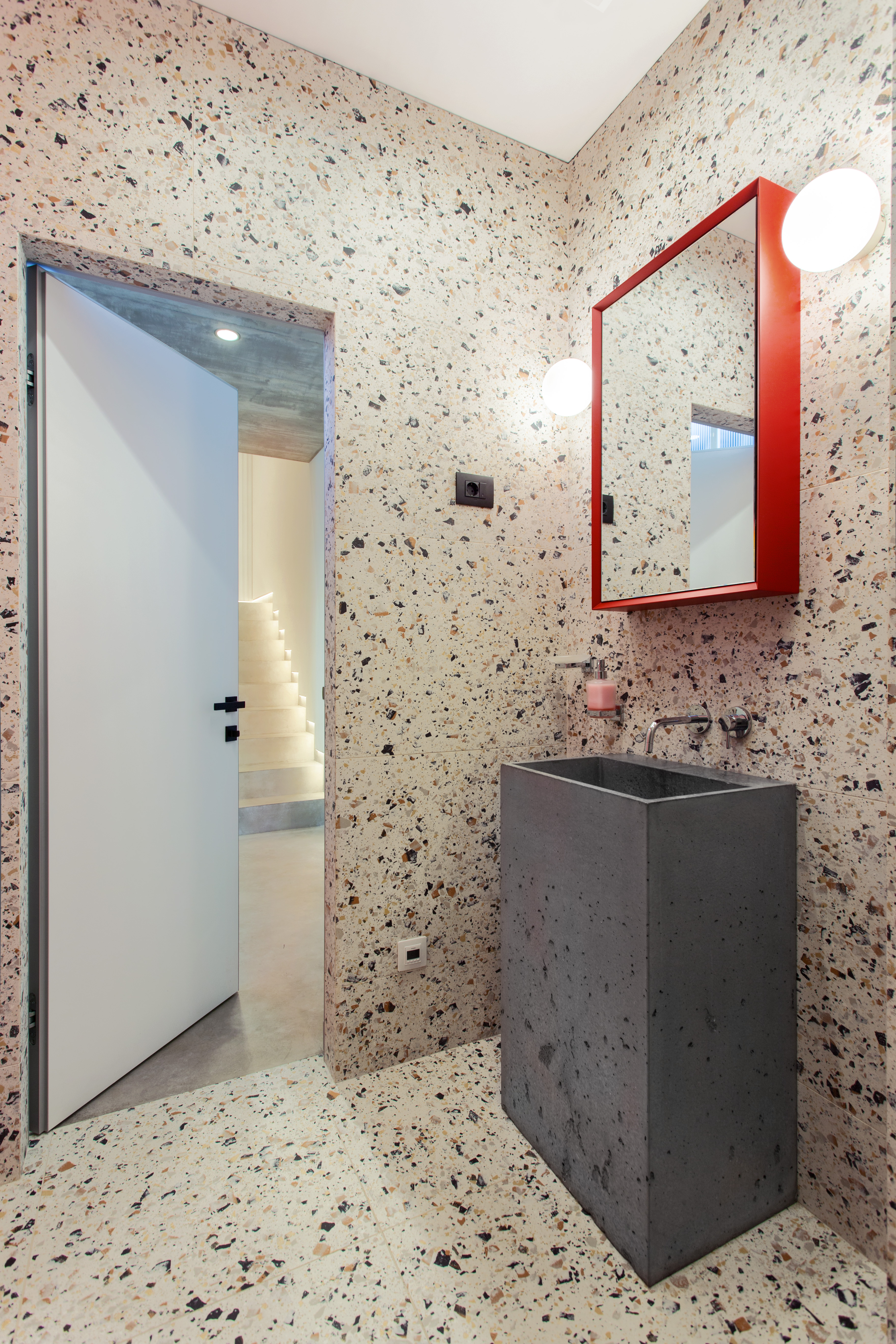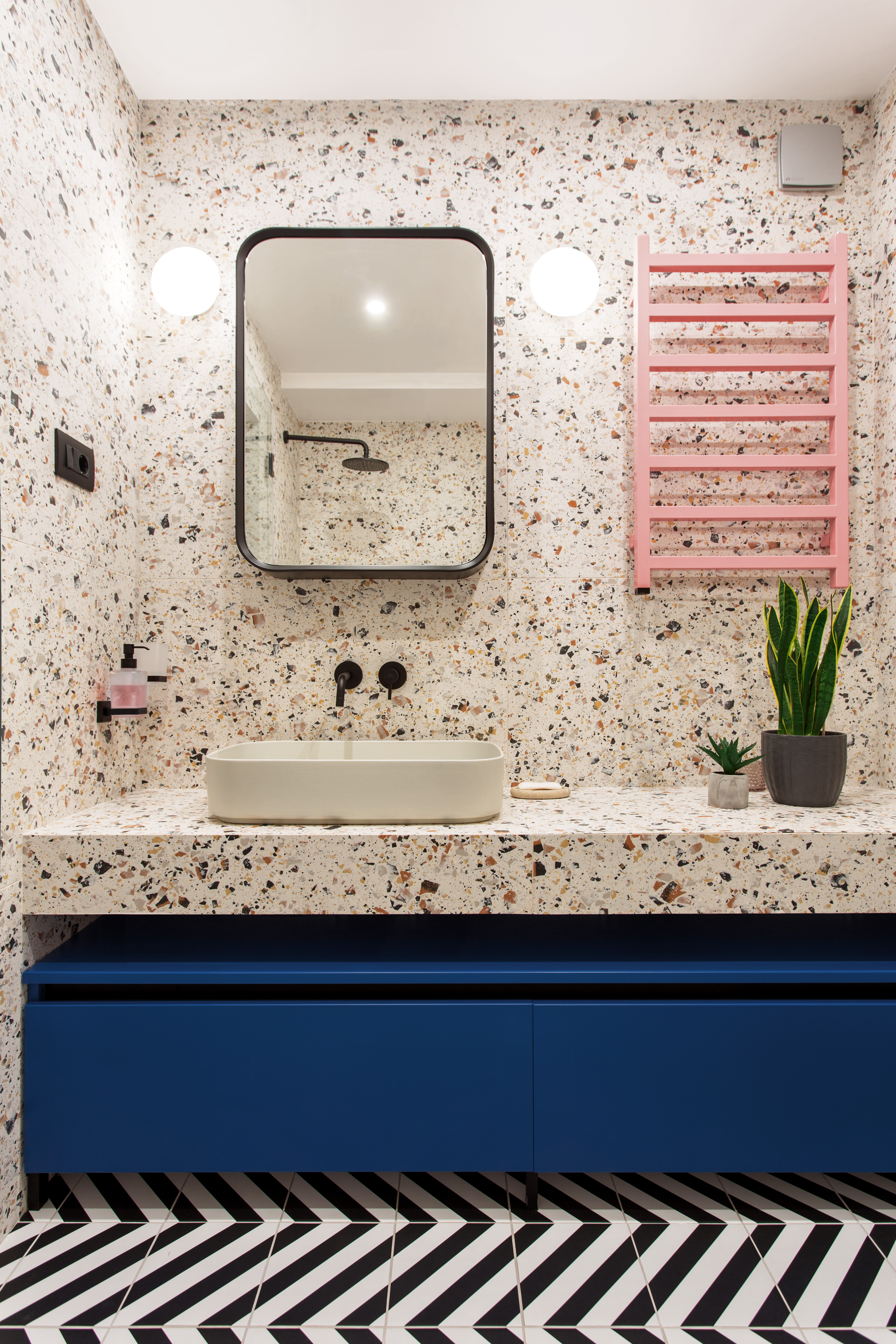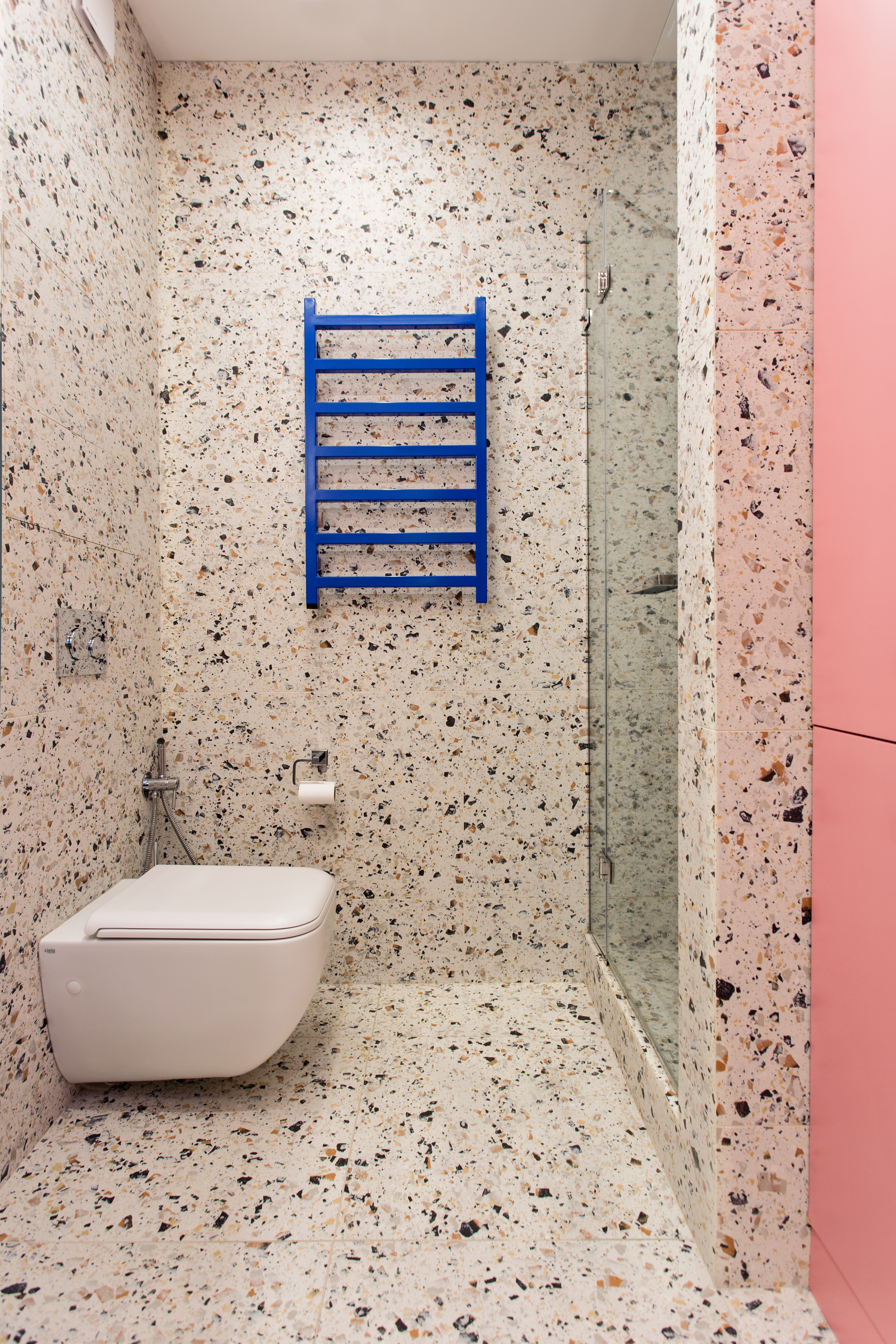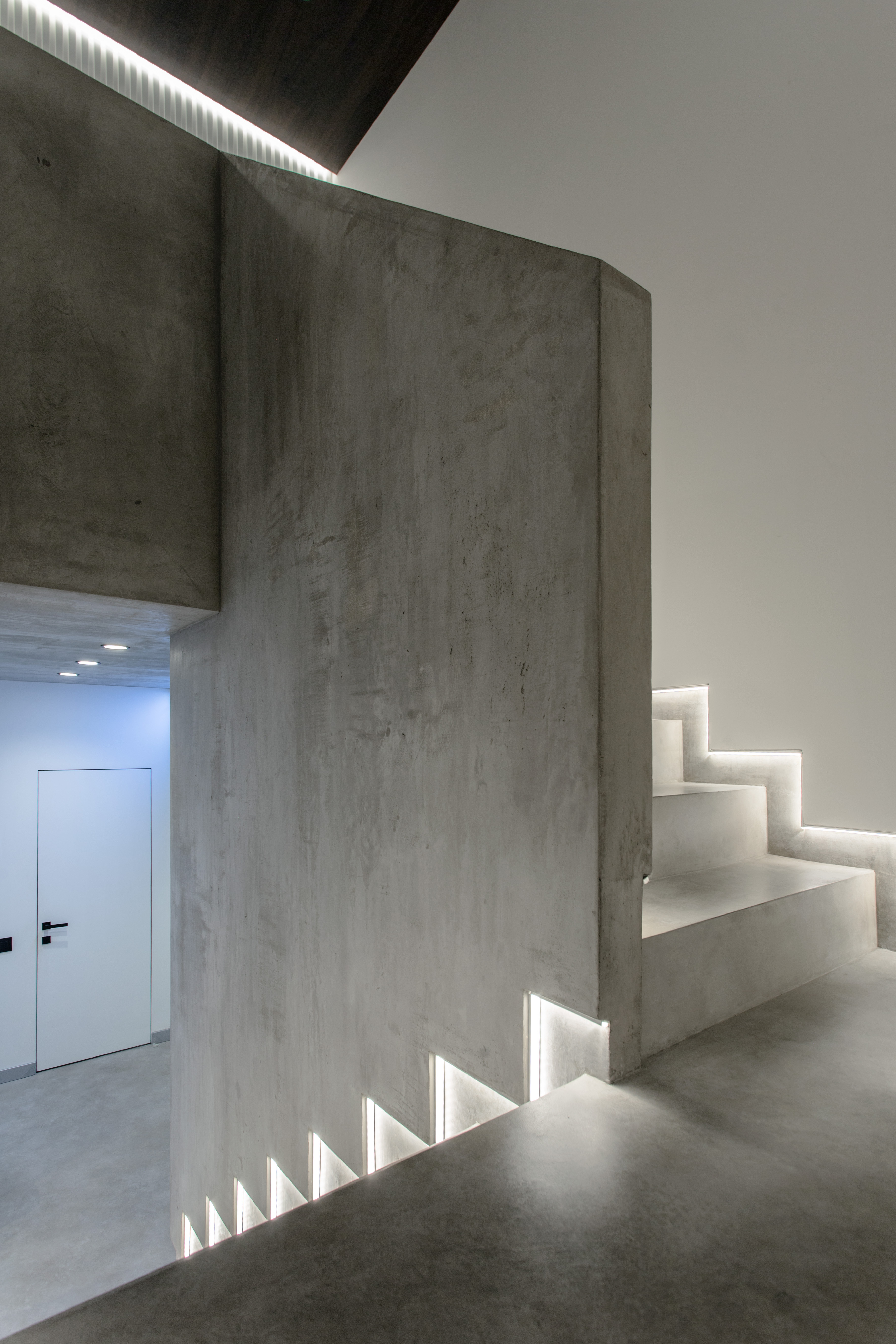 Customers wanted a strict apartment not looked like an office. As a result, the main idea of the project was a combination of rough and contrasting textures of concrete and terrazzo with delicate fabrics textures, soft carpets and strict black and white surfaces.