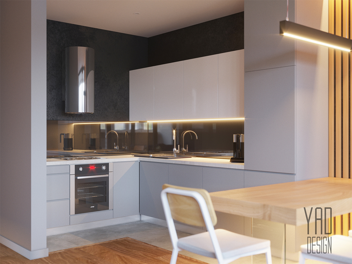 To make a stylish modern space for a small studio apartment. Large sofa and a non-standard solution for the dining area were principal for the customer.