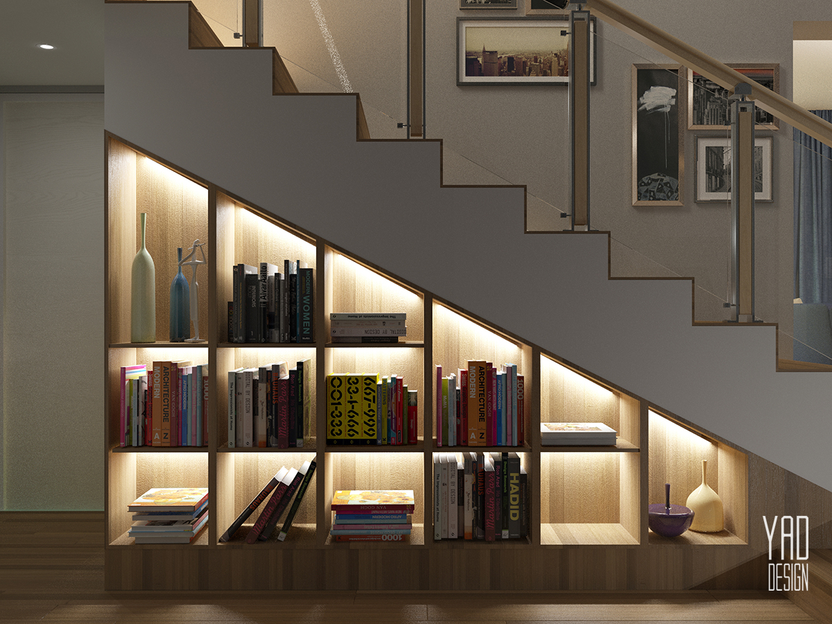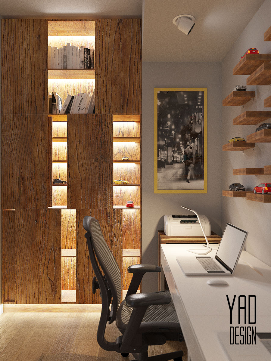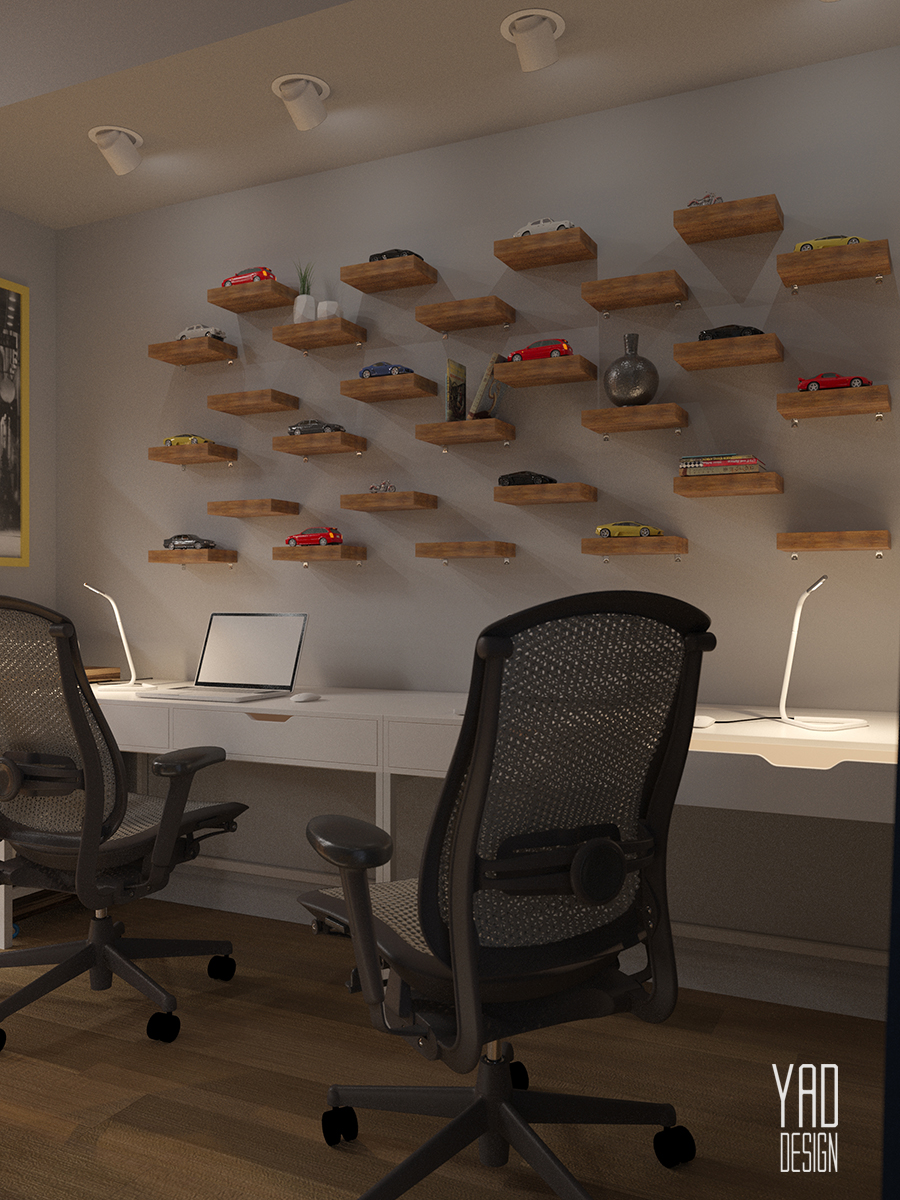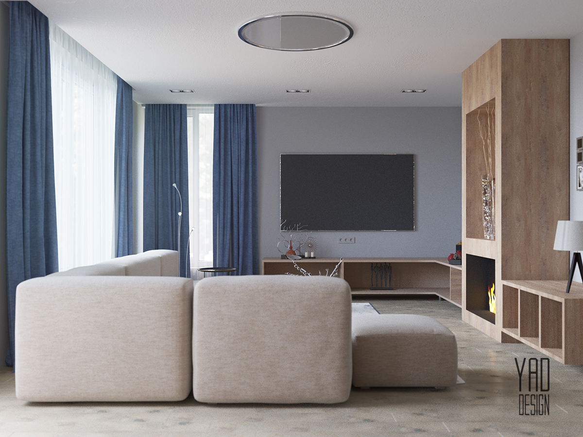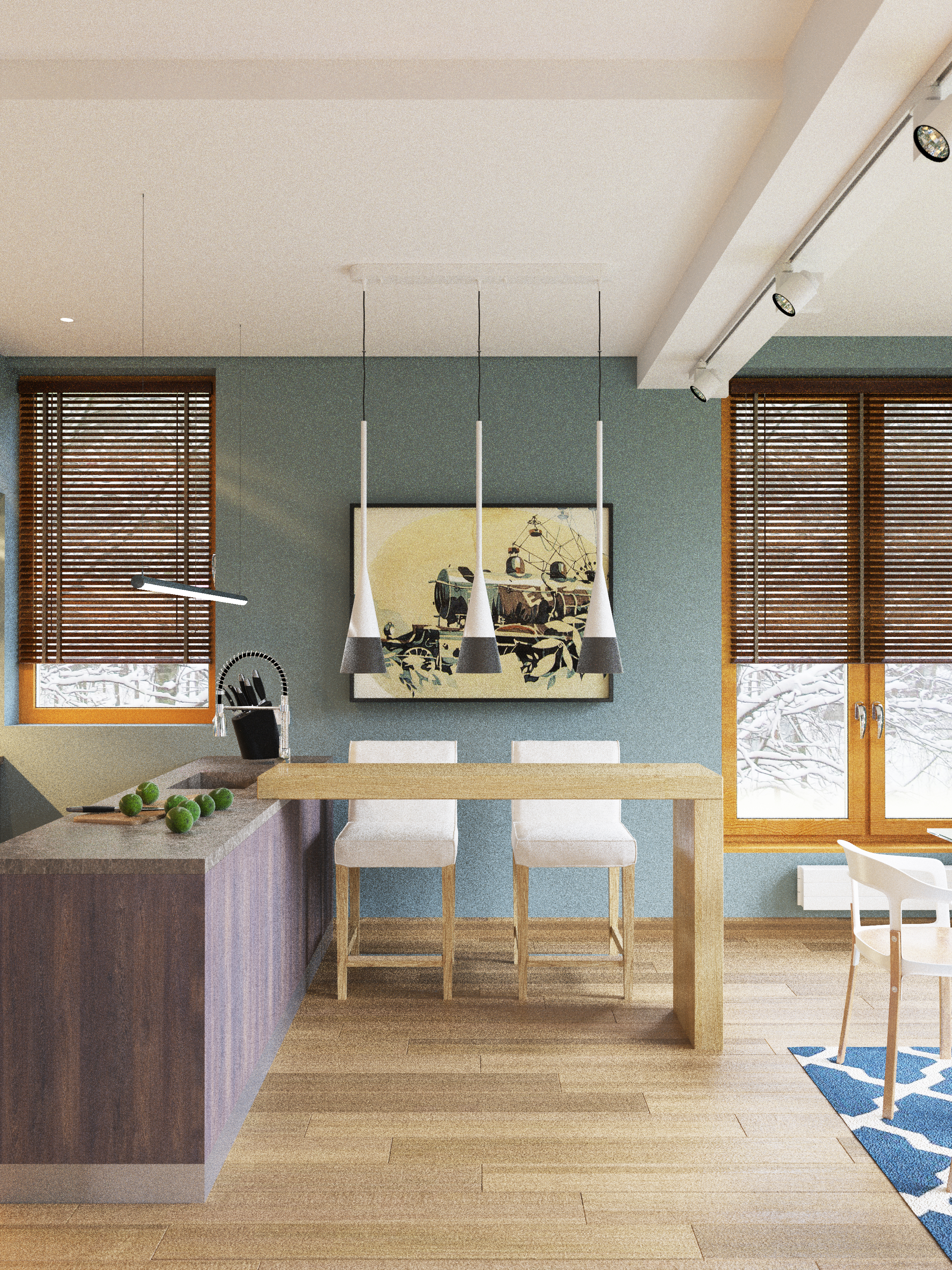To create a discreet interior of a two-story house using cold colors and simple shapes. The customer is an amateur of blue shades and the owner of an impressive car models collection.