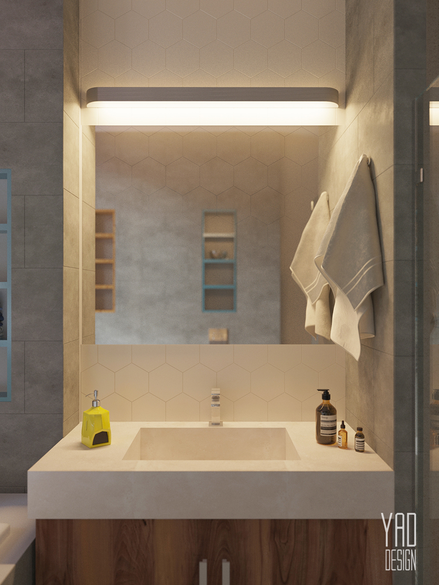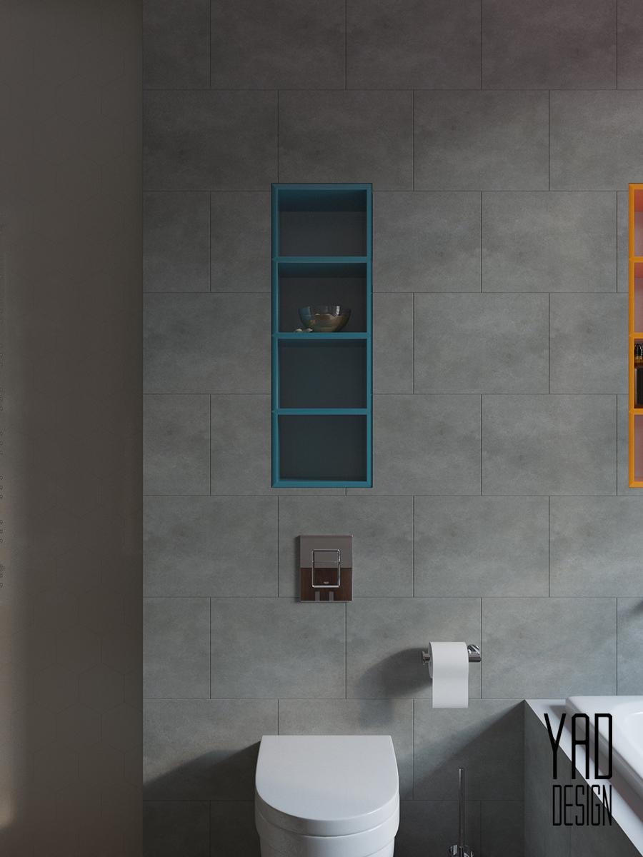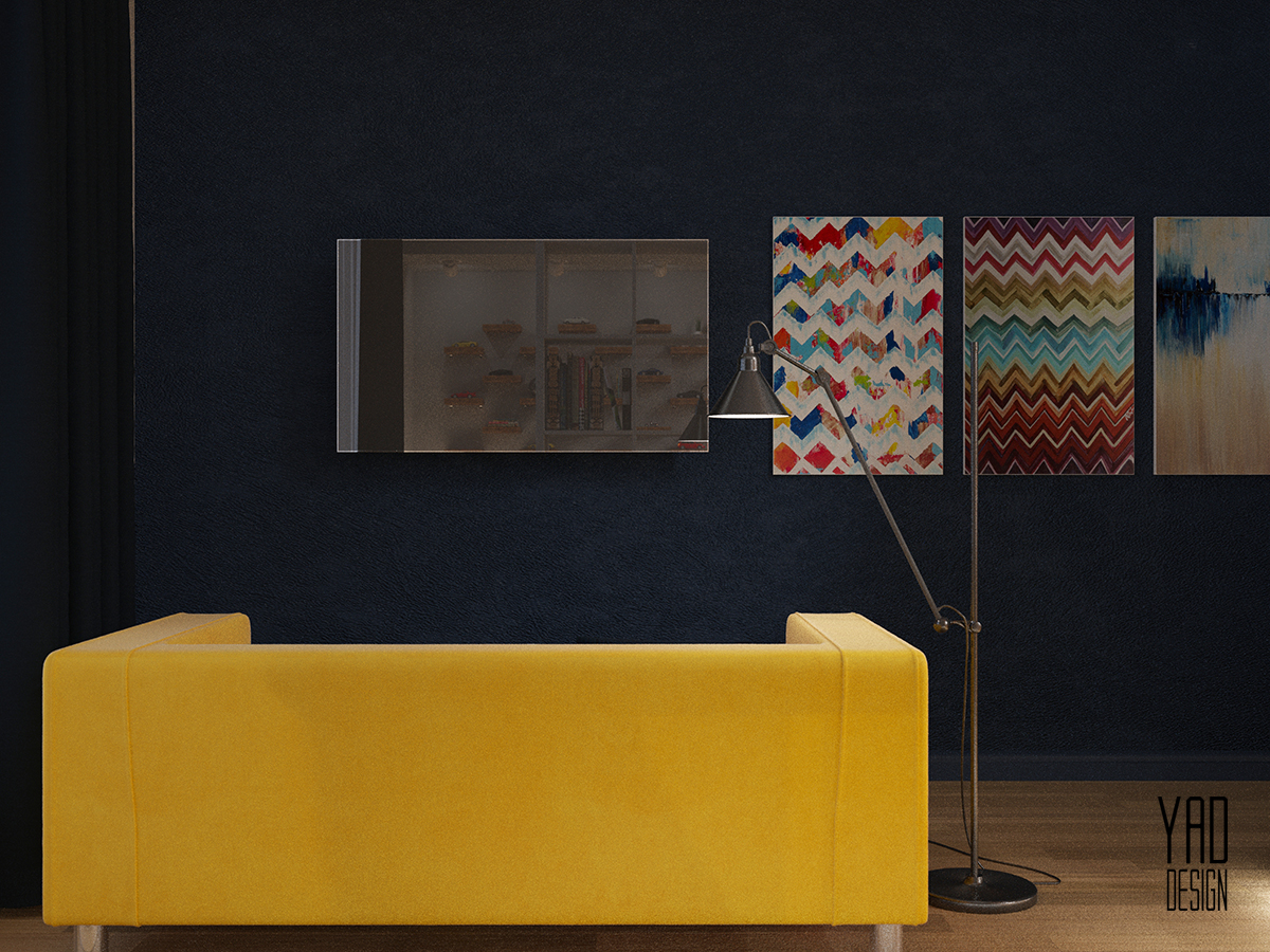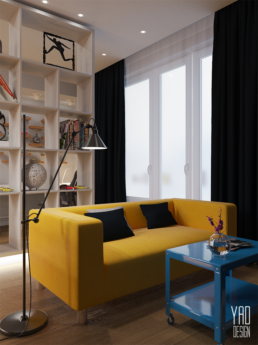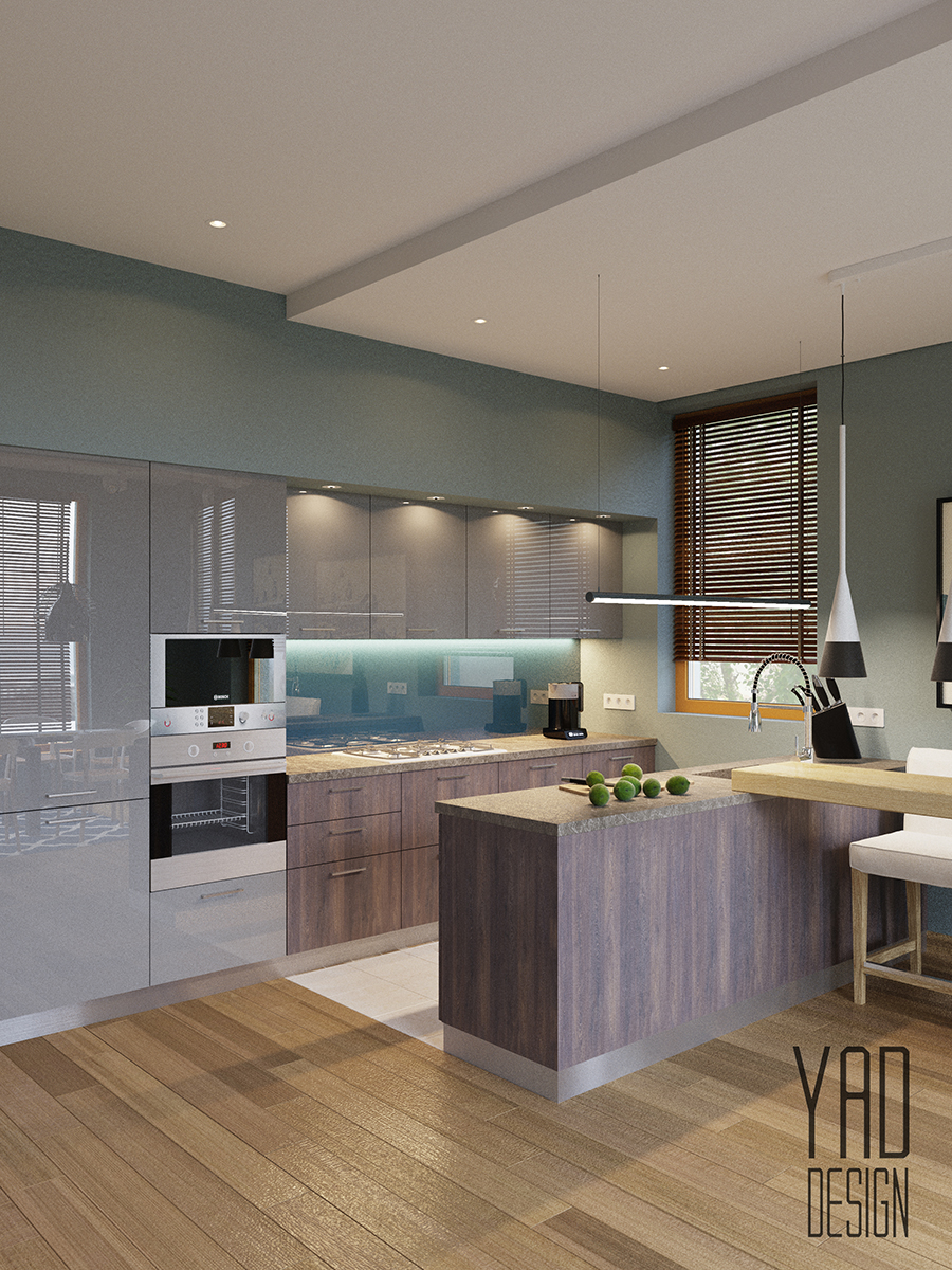 To create a discreet interior of a two-story house using cold colors and simple shapes. The customer is an amateur of blue shades and the owner of an impressive car models collection.