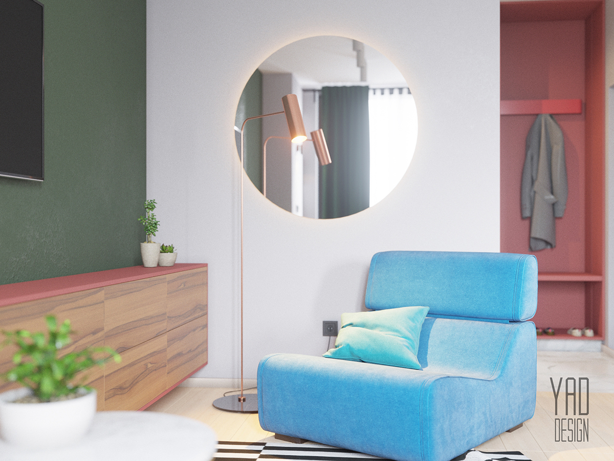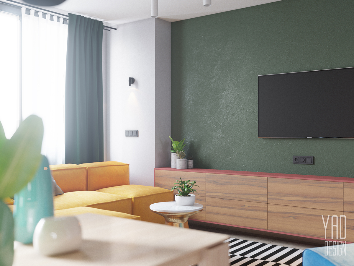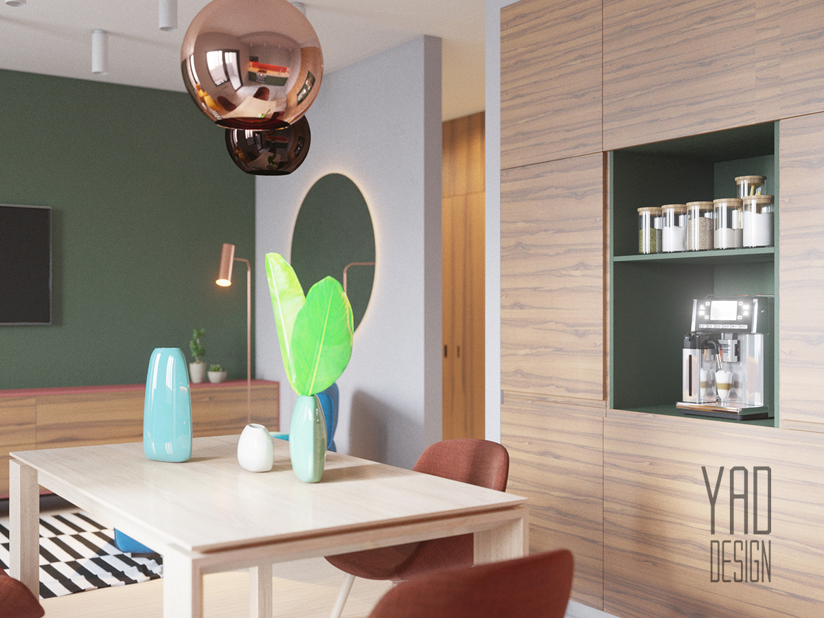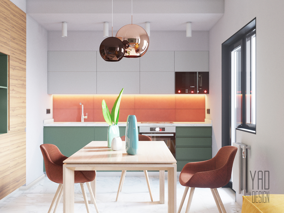 Создать современный интерьер для семьи из 4-х человек. Заказчикам хотелось получить красочный, но не напрягающий интерьер. Пространство необходимо было организовать так, чтобы у хозяев была возможность регулярно собирать за столом до 10 человек. Для этого кухня студия спроектирована таким образом, что столовая зона может быть увеличена в любой момент. Зоны отдыха при этом никак не страдают.