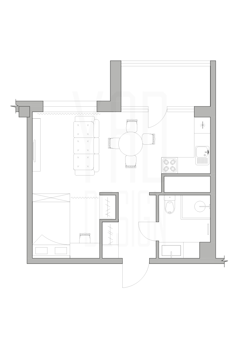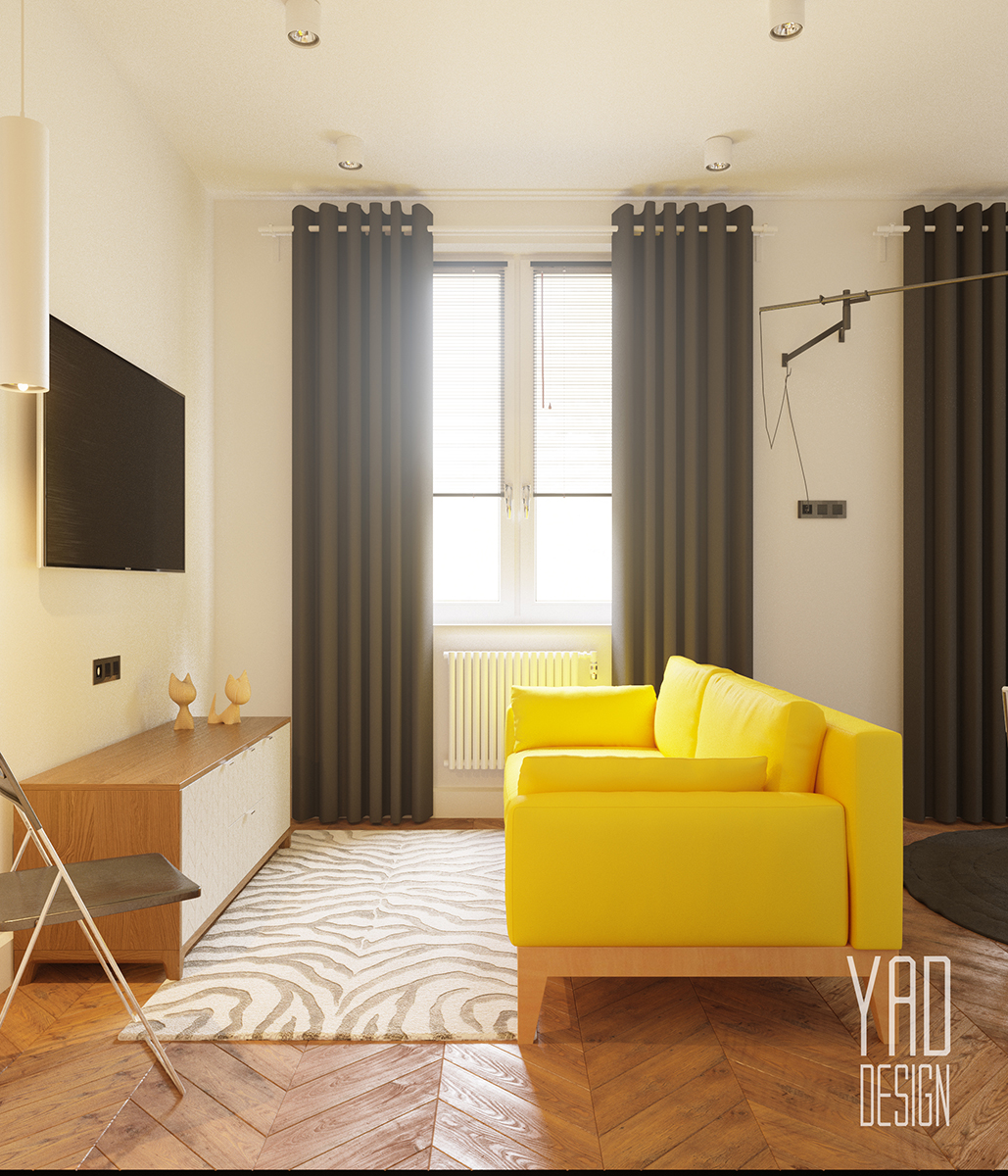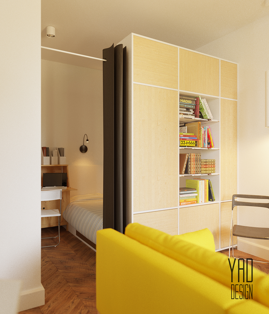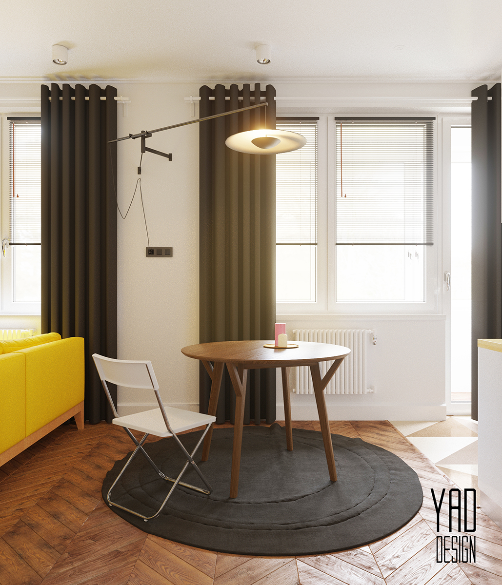 Разработать эскизный проект Создать многофункциональное и эргономичное пространство небольшой квартиры для современной, активной девушки. Задачей было разместить на небольшой площади несколько зон: зоны кухни, столовая зона, зона отдыха, двуспальную кровать, рабочую зону. Так же не стоит забывать об актуальности гардеробной зоны. Благодаря продуманной планировке, получилось разместить сразу несколько глубоких шкафов. Для экономии места, библиотечный стеллаж используется для разграничения спальной зоны и зоны отдыха. Для уменьшения количества острых углов был выбран круглый стол.