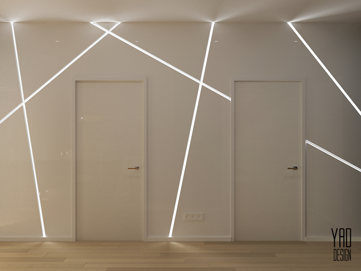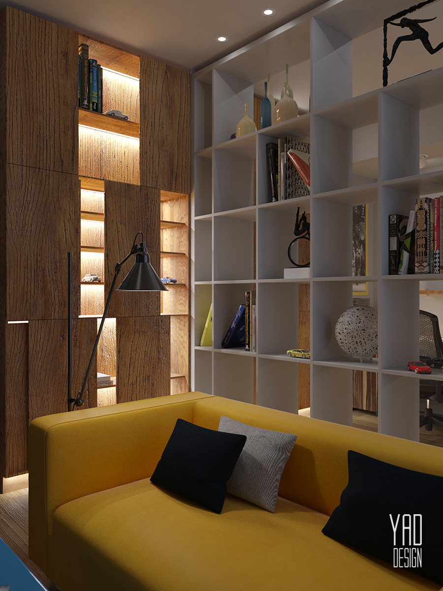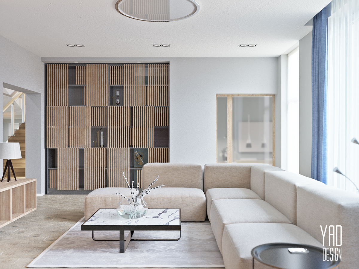 Создать сдержанный интерьер двухэтажного дома используя холодную цветовую гамму и простые формы. Заказчик- любитель оттенков синего и владелец внушительной коллекции моделей автомобилей.